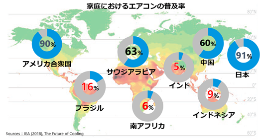 このように、エアコンは人々の暮らしに欠かせないものになっている一方で、気温が高くてもインフラ事情や所得水準などを背景にエアコンの普及がまだ進んでいない国や地域があるのも事実です。IEAによると、インドでは5%、南アフリカでは6%、ブラジルでは16%と言われています。しかし、新興国の発展によって2050年までに世界のエアコンの稼働台数は約3倍に増加すると予測されており、今後、さらなる普及が見込まれています。