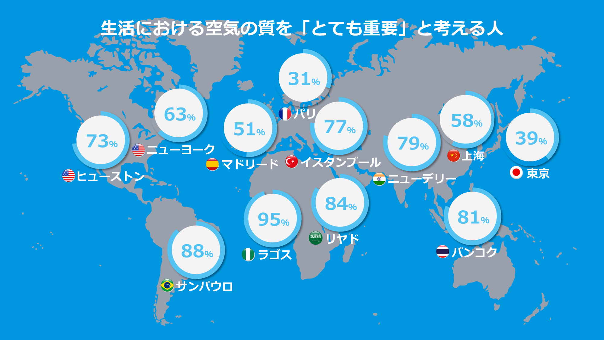「あなたの生活において空気の質は重要ですか」と聞いたところ、「とても重要」と回答した人の割合が最も多かったのはラゴス(ナイジェリア)の95%でした。サンパウロ(ブラジル)、リヤド(サウジアラビア)、バンコク(タイ)、イスタンブール(トルコ)、ニューデリー(インド)、ヒューストン(アメリカ)の5都市でも「とても重要」と回答した人の割合は70%以上となりました。空気は目には見えませんが、これらの都市では日頃から空気を意識している人が多いようです。一方、東京は39%で、パリ(フランス)の31%に次いで低い結果でした。