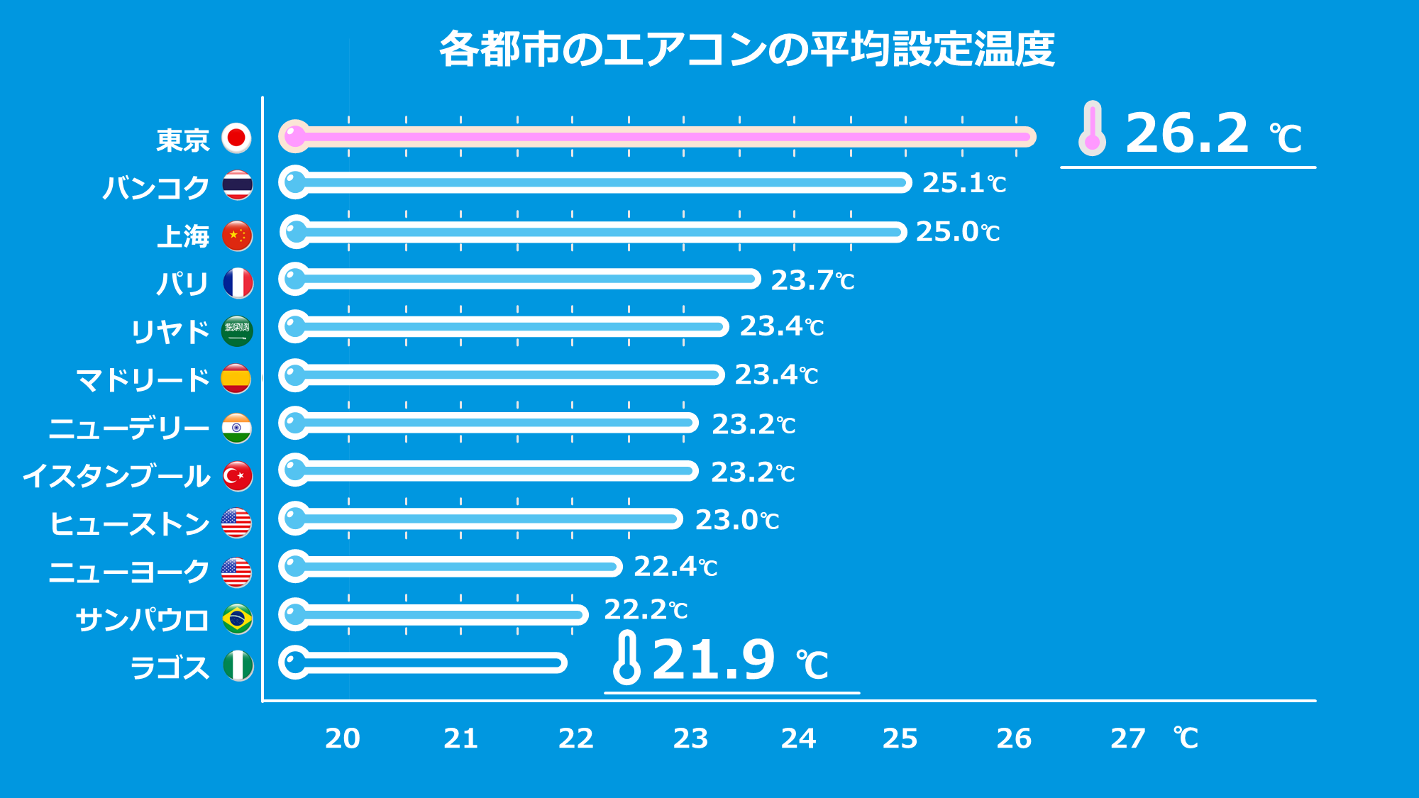 「1年で最も気温が高い1カ月の間に、自宅のエアコンで最も頻繁に設定する温度」について聞き、各都市の「平均設定温度※2」を算出しました。その結果、平均設定温度が最も高いのは26.2℃の東京、最も低いのは21.9℃のラゴス(ナイジェリア)で、その差は4.3℃となりました。ラゴスに次いで平均設定温度が低いのは、サンパウロ(ブラジル)の22.2℃、ニューヨーク(アメリカ)の22.4℃です。出身国や個人の体質で温度の感じ方は変わると言われていますが、ラゴス、サンパウロ、ニューヨークでは、より低い温度を快適と感じる人が多いようです。