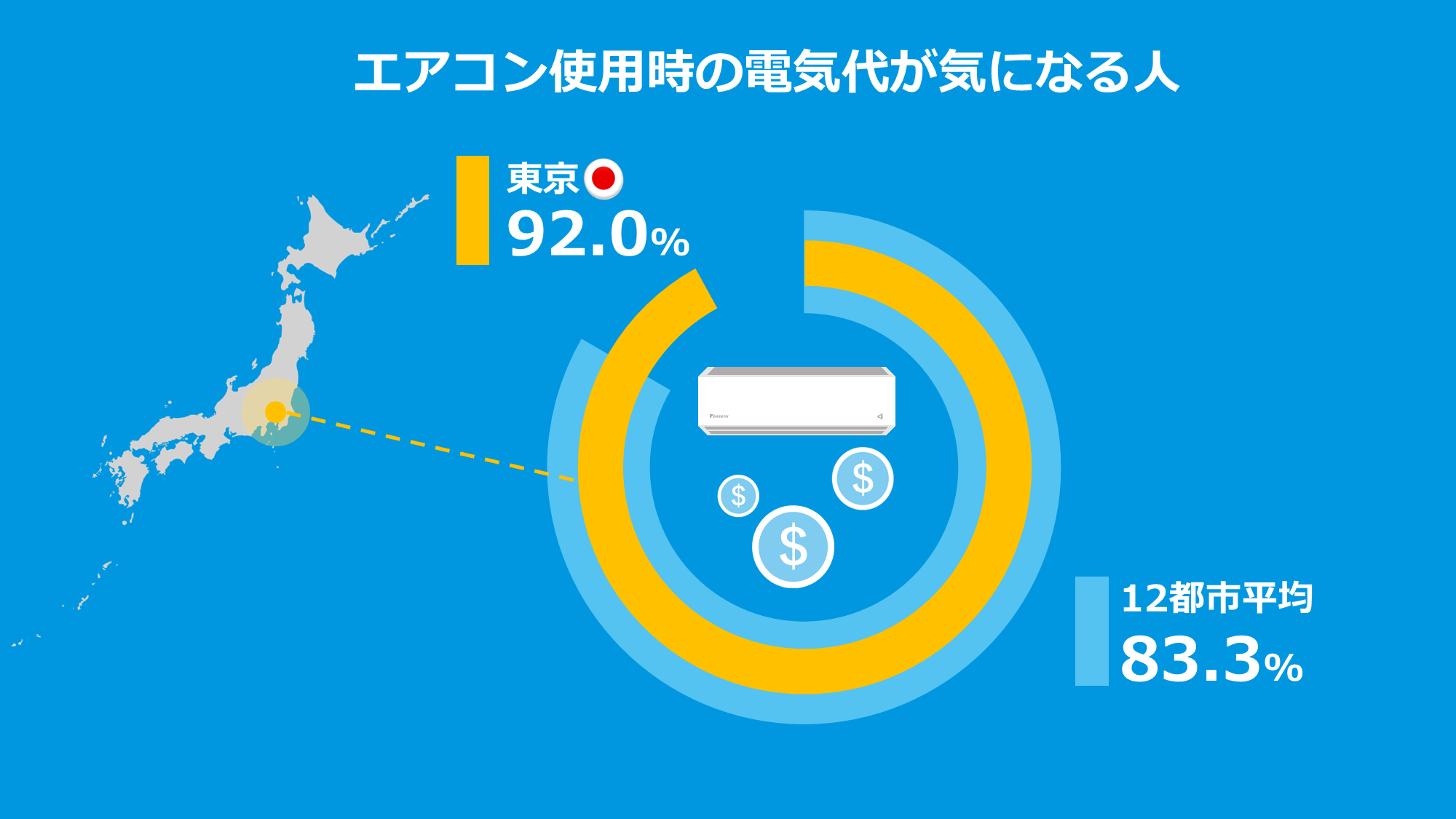 日本では省エネを促すために、室温28℃を目安にしてエアコンの温度を設定することを政府が推奨しています。東京の平均設定温度が高いという結果になった背景には、環境を意識した政府の呼びかけも影響していそうです。また、今回の調査から、東京では90%以上の人がエアコンを使用する際に電気代を気にしており、12都市の中で最も多いことがわかりました。さらに、「節電・省エネのために、自宅でエアコンを使用する時に実施している工夫」として、「設定温度を高め(冷房時)もしくは低め(暖房時)にする」人の割合も、12都市の中で東京が最も高く、71%となりました。東京の平均設定温度が高いのは、電気代に対する意識の高さも関係しているのかもしれません。