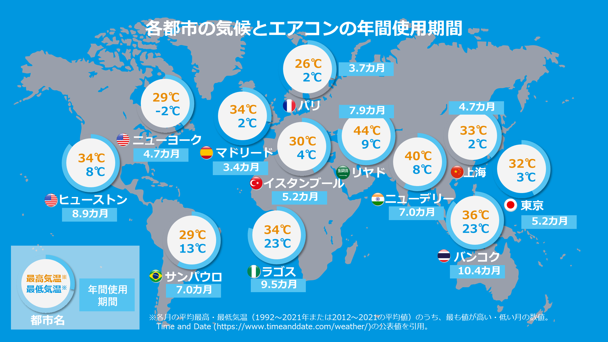 日本では、気温が高い数カ月のみエアコン(冷房)を使用する人が多いですが、世界では年間でどのくらいの期間使用されているのでしょうか?
