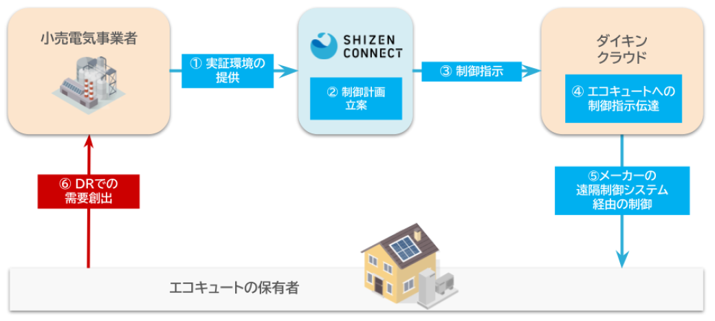 | 目的 | 『Shizen Connect』と『ダイキンエコキュート』の遠隔制御システムのクラウド連携による需要創出DRの技術性、経済性、及びCO2削減効果の評価 |
