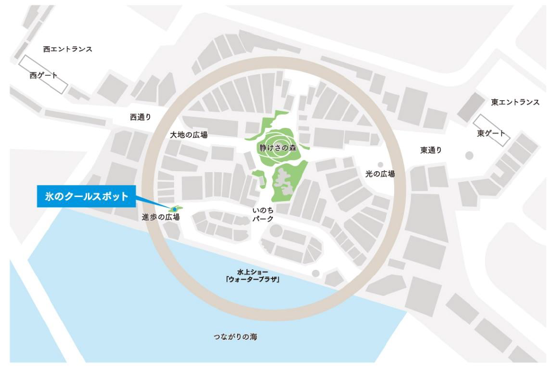 氷のクールスポットは、万博会場の南西部に位置する「進歩の広場」に設置します。万博会期中はいつでも利用が可能です。