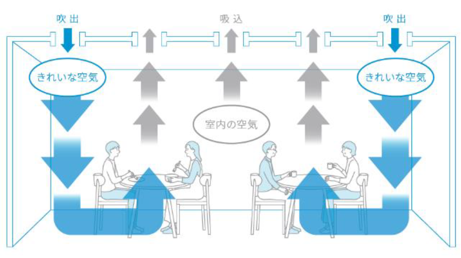 「天井吹出型の置換換気空調」のイメージ