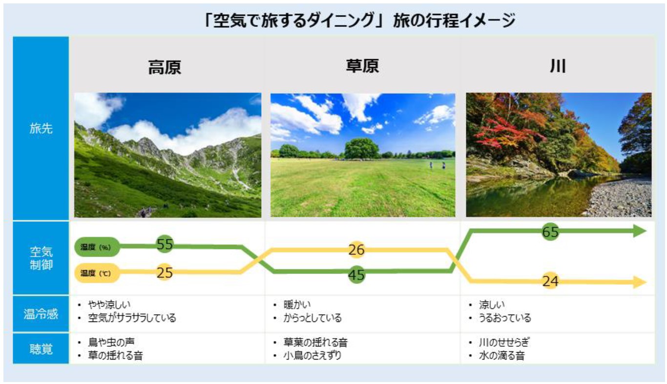 「空気で旅するダイニング」は、空調制御と映像・音響刺激を組み合わせることで、未来の空気体験を可能にする個室です。ダイキンが得意とする温度・湿度・気流のコントロール技術と、東京大学の視聴覚に関わるクロスモーダル技術を掛け合わせることで、実在する心地よい空気が感じられるスポットを個室内に再現します。個室の壁いっぱいに高原や草原を映し、その景色に調和した空気環境と環境音を合わせることで、まるで自然の中で食事をしているような体験ができます。