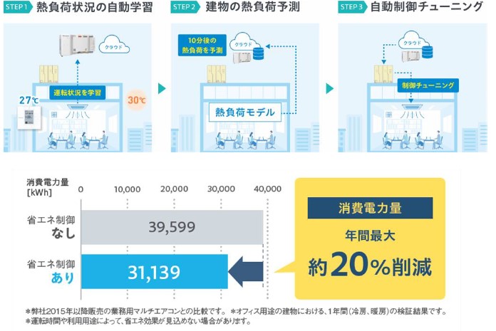 本サービスは、空調機を遠隔から自動制御することで消費電力量の削減と快適性の両立を実現するサービスです。空調機の運転データとクラウドから得られる天気や日射などの外部情報からAIが部屋ごとの熱負荷を予測し、冷やしすぎや暖めすぎなどのムダな運転を防ぎ、省エネ性と快適性を維持します。国内外の30件の検証物件において、快適性を低下させることなく、消費電力量を通年最大約20%※2削減しました。
