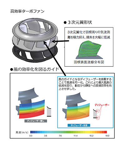 ICT装置用空調機の省エネ性向上には、室内機の運転効率を高める必要があります。ダイキンは独自の高効率ターボファンとIPMモータを組み合わせて省エネ性を向上させています。高効率ターボファンは、ファンの3次元翼化で羽周りの気流剥離を極力抑え、エネルギーの損失を大幅に低減させると同時に、風のガイドとなるデフューザーを搭載することで風速の均一化を図り、省エネ性を高めています。また、ダイキン独自の気流解析技術を用いることで、空調機内の空気抵抗を最小化へと繋げた結果、従来機よりも年間消費電力量の約20%削減を実現しました。