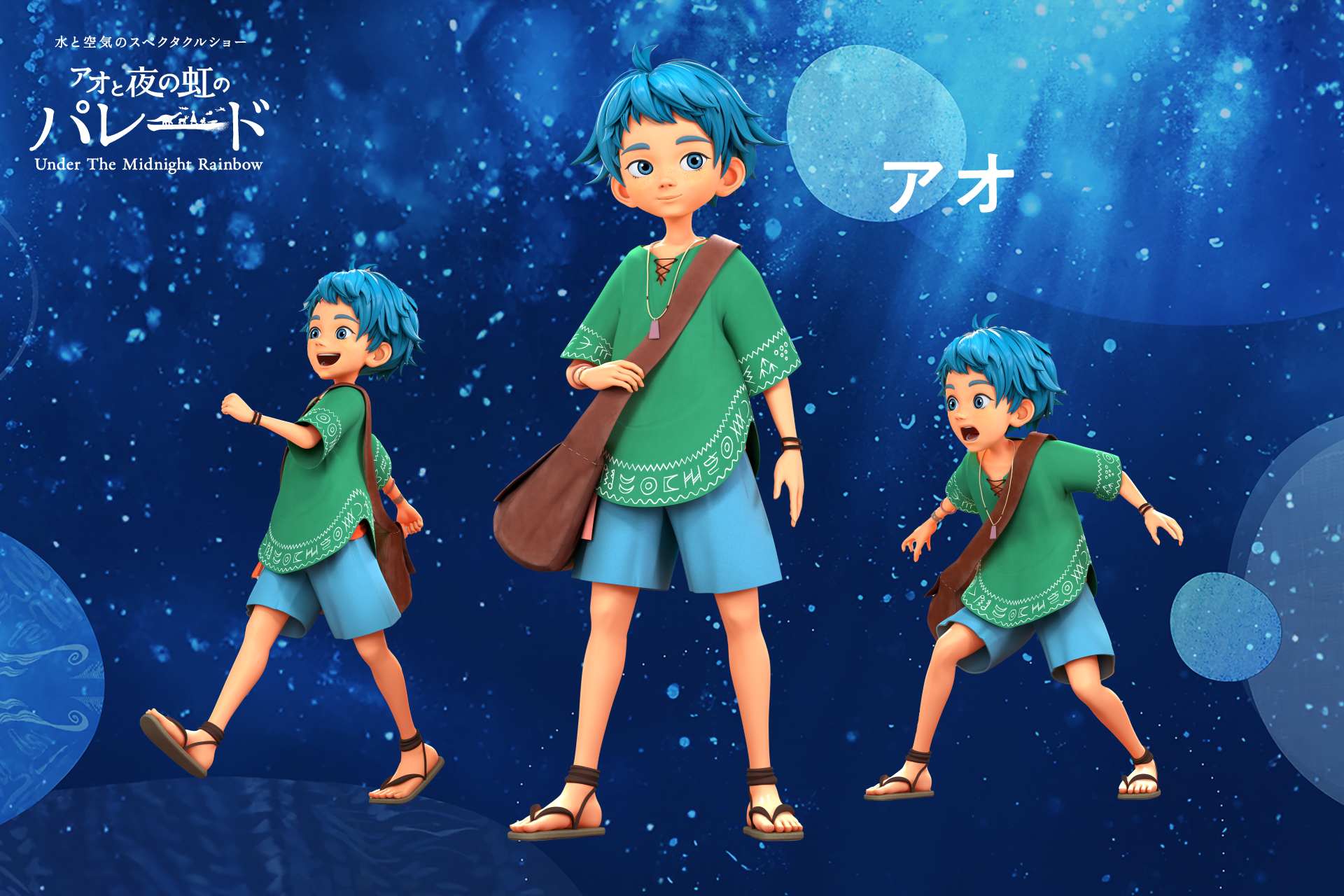 卓越した歌唱力と表現力が魅力の若手俳優、毛利 花さんを主人公の「アオ」役 に抜擢。透明感溢れる伸びやかな歌声が、ショーを華やかに彩ります。また、「アオ」を祝祭へと導く「ドードー」の声を務めるのは、個性的なキャラクターを多彩に演じ分けるタレントの友近さん。関西弁の軽快なトークがユーモアと親しみを与え、物語にさらなる魅力を加えます。そして、島に伝わる歌と夜の虹の言い伝えを「アオ」に教える「おばあちゃん」の声は、夏木 マリさんが担当。物語のはじまりにおいて重要な役割を果たし、観客をショーに引き込みます。