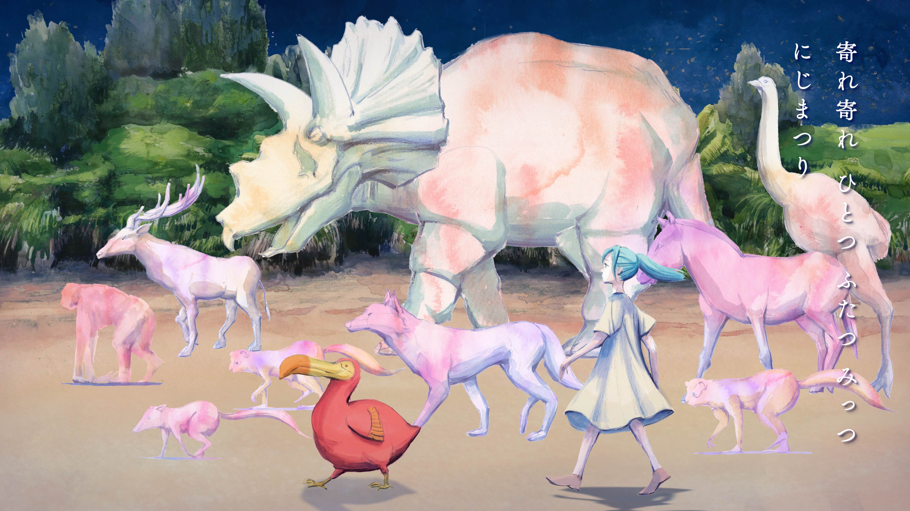 水上ショーの音楽を手掛ける作編曲家/音楽プロデューサーの菅野(かんの)よう子さんが作曲・プロデュースしたテーマソング「にじまつり」のミュージックビデオ(MV)を公開。舞台となる島に伝わる伝承歌である「にじまつり」は、民謡、島唄、わらべ唄といった伝統的な音楽をイメージの源としながら、時空を超えて私たちのDNAレベルで記憶されているメロディを探し求めて完成させた作品です。水と空気を介して繋がる生きものたちの生命力を、力強く表現しています。 МVのイラストレーションは、今回のショーで大事にしている生命(いのち)や自然を、やさしく素敵に描ける方として、数多くの有名アーティストとのコラボレーション作品を手掛ける映像作家の加藤 隆(りゅう)さんが担当します。物語の“エピソードゼロ”として、主人公「アオ」が生まれるずっと前の島に起きた、夜の虹にまつわる逸話を描き、伝承歌と物語を結びつけます。
