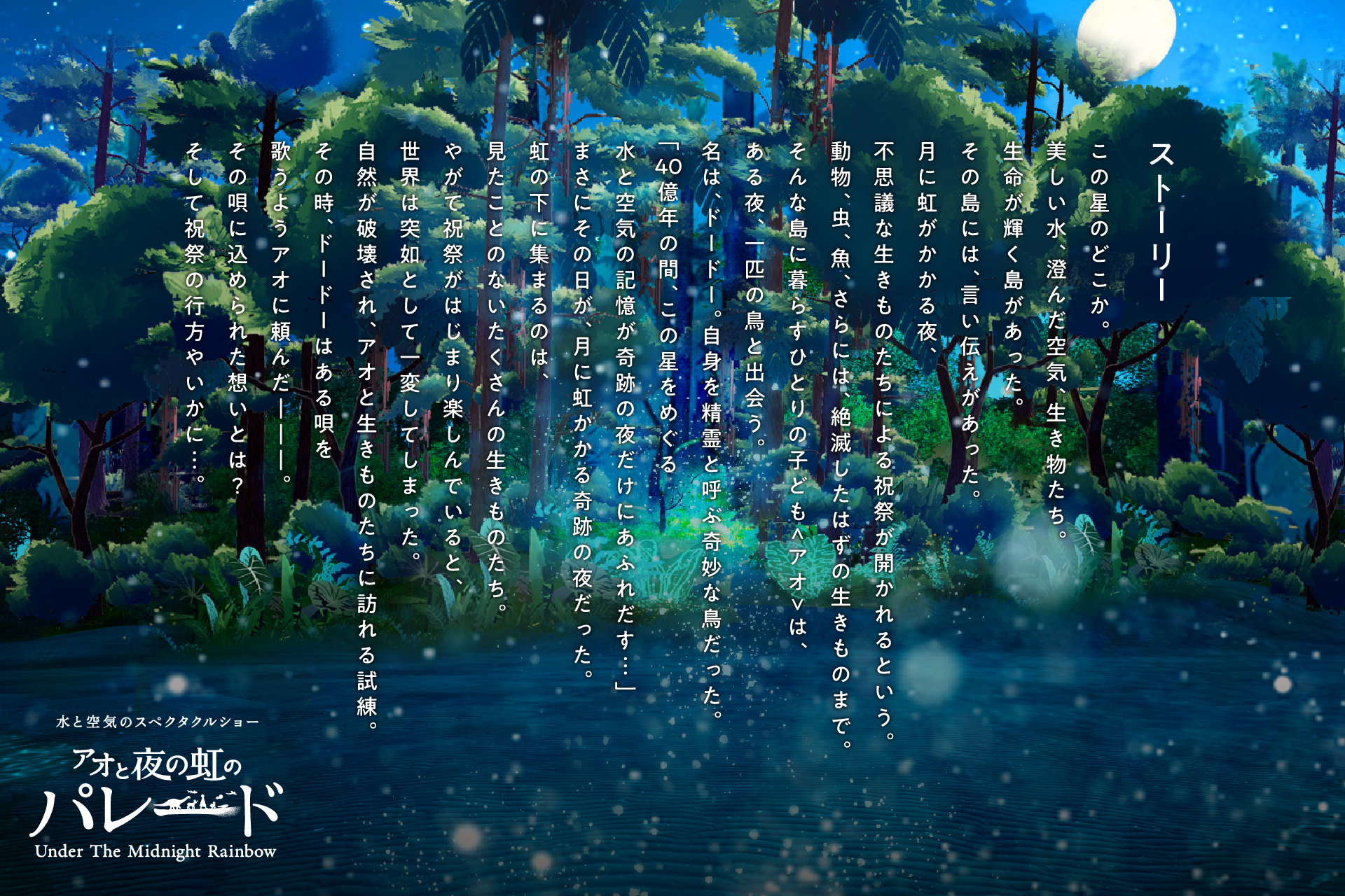 月夜に虹がかかる時、生きものたちによる祝祭が開かれるという言い伝えが残る島を舞台に物語が展開します。主人公の子ども「アオ」と水と空気の精霊「ドードー」が神秘的な夜の虹の下に出会い、楽しく華やかな生きものたちの祝祭が繰り広げられます。