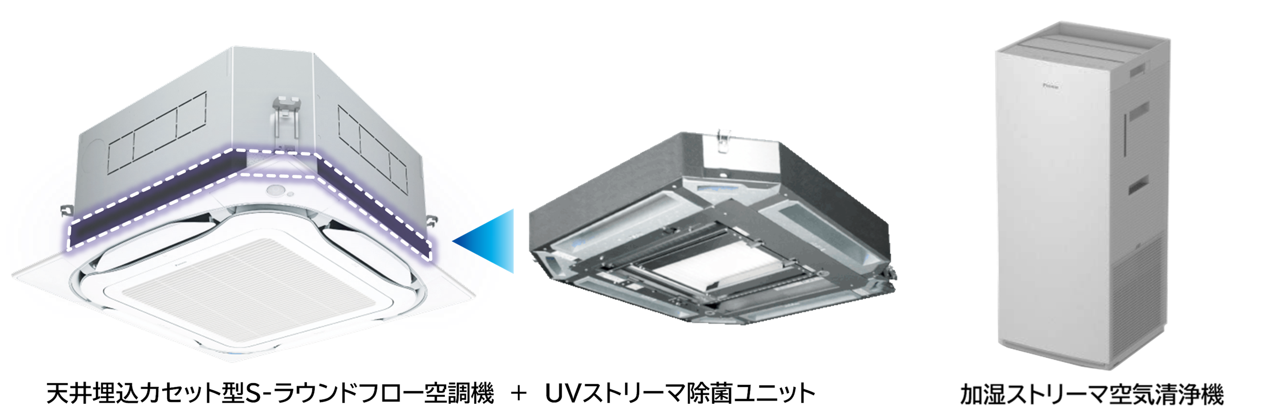 本検証では、感染者がマスクをしていない状態を想定し、換気装置と感染者の位置に対して、空気清浄機の有無や設置位置および空調機の併用やUVストリーマ除菌ユニット(中性能フィルタ付)の有無など17 のケースで詳細に評価しました。その結果、ダイキンのUVストリーマ除菌ユニット(中性能フィルタ付)を装着した空調機と最適な位置※1に配置した空気清浄機を同時に30分間稼働させた場合、室内全体のエアロゾル濃度を最大88%低減し、非感染者が曝露する範囲におけるエアロゾル濃度を最大94%低減する可能性があることを確認しました。