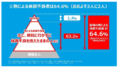 谷口先生:これまで見えていた熱中症は「氷山の一角」で、「熱」の影響を受けた潜在的な患者がたくさんいることが改めて分かります。熱による体調不良者はおおよそ3人に2人で、おおよそ3人に1人と言われる国民病・スギ花粉症を上回っています。