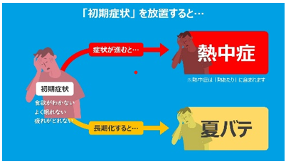 谷口先生:「熱あたり」は、暑さが体に及ぼすダメージ全般を指します。食あたりや水あたりを起こすことがあるように、「熱」にあたる、つまり体に熱がたまり、うまく逃がせず体調を崩している状態を意味します。「食欲がわかない」「よく眠れない」「疲れがとれない」などの初期症状から始まり、放置すると熱中症を発症する可能性があります。また、「熱あたり」状態が長引くと、いわゆる“夏バテ”につながることもあります。