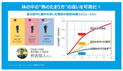 ダイキン・重政:普段の生活でも体に熱はたまります。東京理科大学の仲吉教授が開発した、外部環境の情報と生体情報を融合した「人体熱収支モデル」のシミュレーションによると、日なたを早歩きした場合、日陰をゆっくり歩いた場合と比べて深部体温が0.7℃高くなることが分かっています(周囲の環境や歩く速さよって、体への熱のたまり方が変わる)。