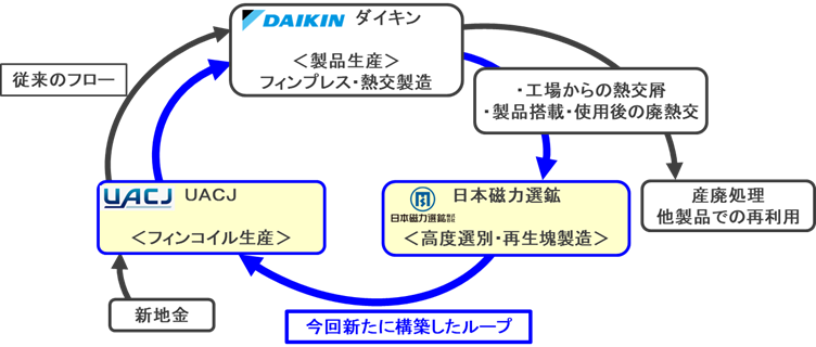 日本磁力選鉱株式会社(本社:福岡県北九州市、代表取締役社長:原田 信、以下 日本磁力選鉱)、ダイキン工業株式会社(本社:大阪府大阪市、代表取締役社長兼COO 竹中 直文、以下 ダイキン)、株式会社UACJ(本社:東京都千代田区、代表取締役:田中 信二、以下 UACJ)は、このほど、空調機の熱交換器の水平リサイクル※1技術を共同で実証しました。空調機のアルミフィンの再生技術の実証実験の成功は、業界で初めて※2となります。