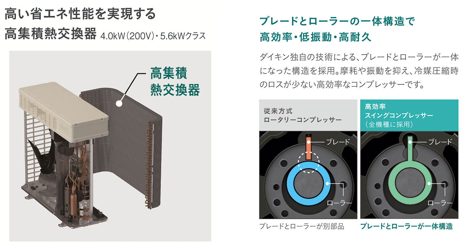 室外機を改良することで機器の省エネ性を向上し、4.0kWクラス(14畳程度用)でAPF7.3、5.6kWクラス(18畳程度用)でAPF6.6を実現しました。熱交換器の表面積を拡大し、圧縮機には従来よりも動力ロスが少ない高出力モーターを採用しました。本商品は、一般的なルームエアコンの設計上の標準使用期間10年を過ぎた当社機種と比べ、年間消費電力量を約8%※9削減します。