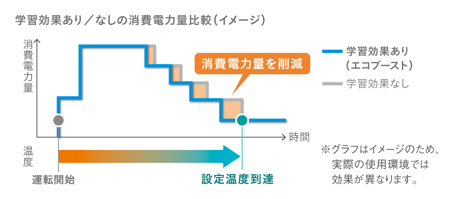 エアコンは、起動時に室温をすばやく設定温度に到達させるために多くの電力を消費します。起動時の電力を抑えると、設定温度への到達が遅くなり、快適になるまでに時間がかかります。本商品は起動時に快適性を落とさず、消費電力を抑える「エコブースト制御」を新たに搭載しました。従来モデルは、室外機が過酷な環境に設置された場合でもすばやく立ち上がるよう、省エネ性よりも設定温度までの到達時間を重視し起動時の運転を制御していました。「エコブースト制御」は設置環境や使用状況等を学習することで、設定温度までの到達時間は従来モデルのままで消費電力量を冷房時に最大5%、暖房時に最大8%削減します。