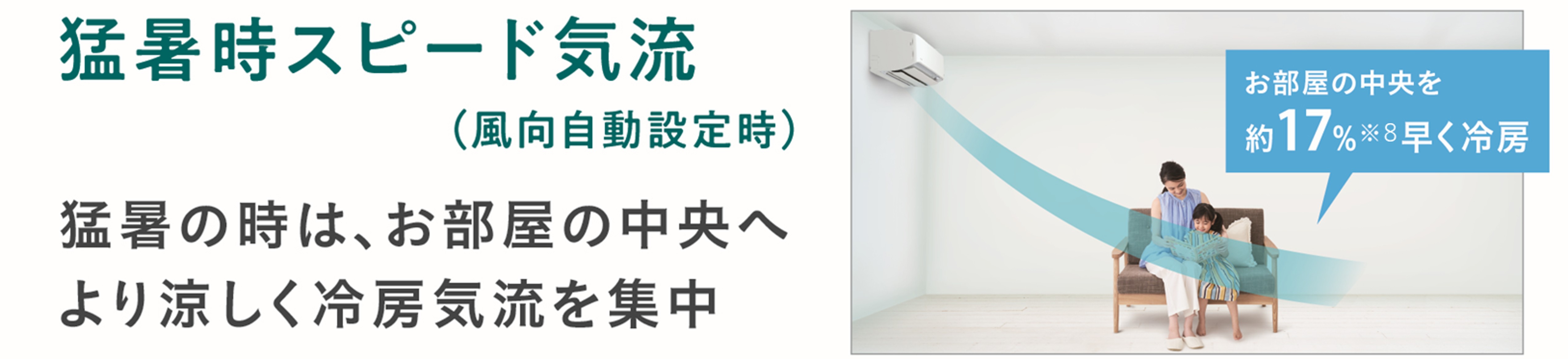 外気温が35℃以上の環境でエアコンを起動した場合、室内をすばやく冷やす機能を新たに搭載しました。従来、起動時は快適性の観点からサーキュレーション気流により人に風をあてないことを優先した運転をしていました。本商品は外気温が35℃以上の場合には室温を下げることを優先し、部屋の中央付近に向かって涼風を届けることで、従来の冷房運転と比較して設定温度到達までの時間を約17%短縮することが可能です。