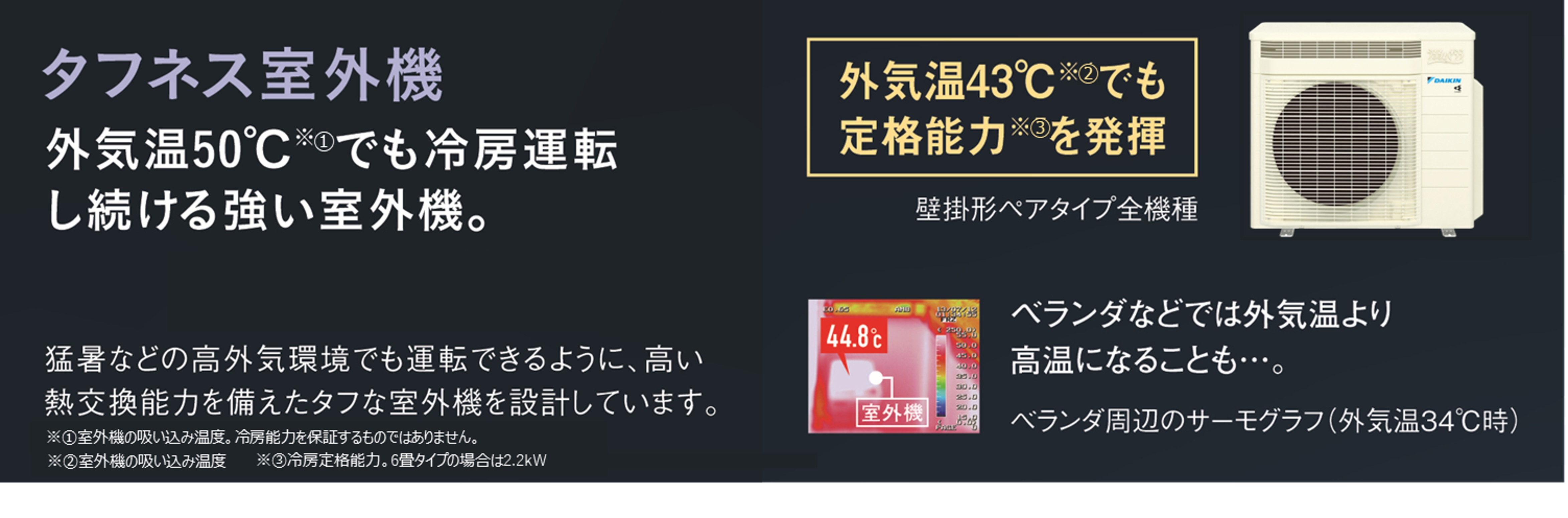 夏場の気温が高い日、ベランダなどの狭小スペースは室外機まわりに熱がこもりやすい環境になります。本商品は猛暑などの高外気環境でも運転できるように、高い熱交換能力を備えたタフな室外機を設計しており、外気温50℃※10でも連続して冷房運転が可能です。
