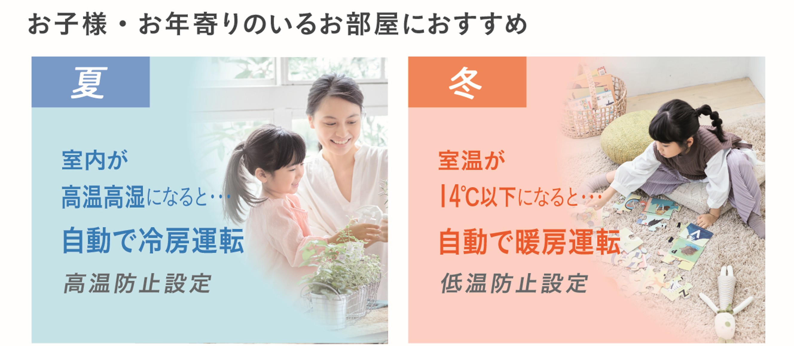 リモコンであらかじめ設定しておくと、エアコンが停止中でも定期的に室内の温度や湿度をみはり、高温、高湿度になった場合に自動で冷房をスタートします。冬場は室内が低温になった場合に自動で暖房を開始します。年間通してお部屋の温度を見守るため、高齢者やお子様が過ごす部屋にもおすすめです。