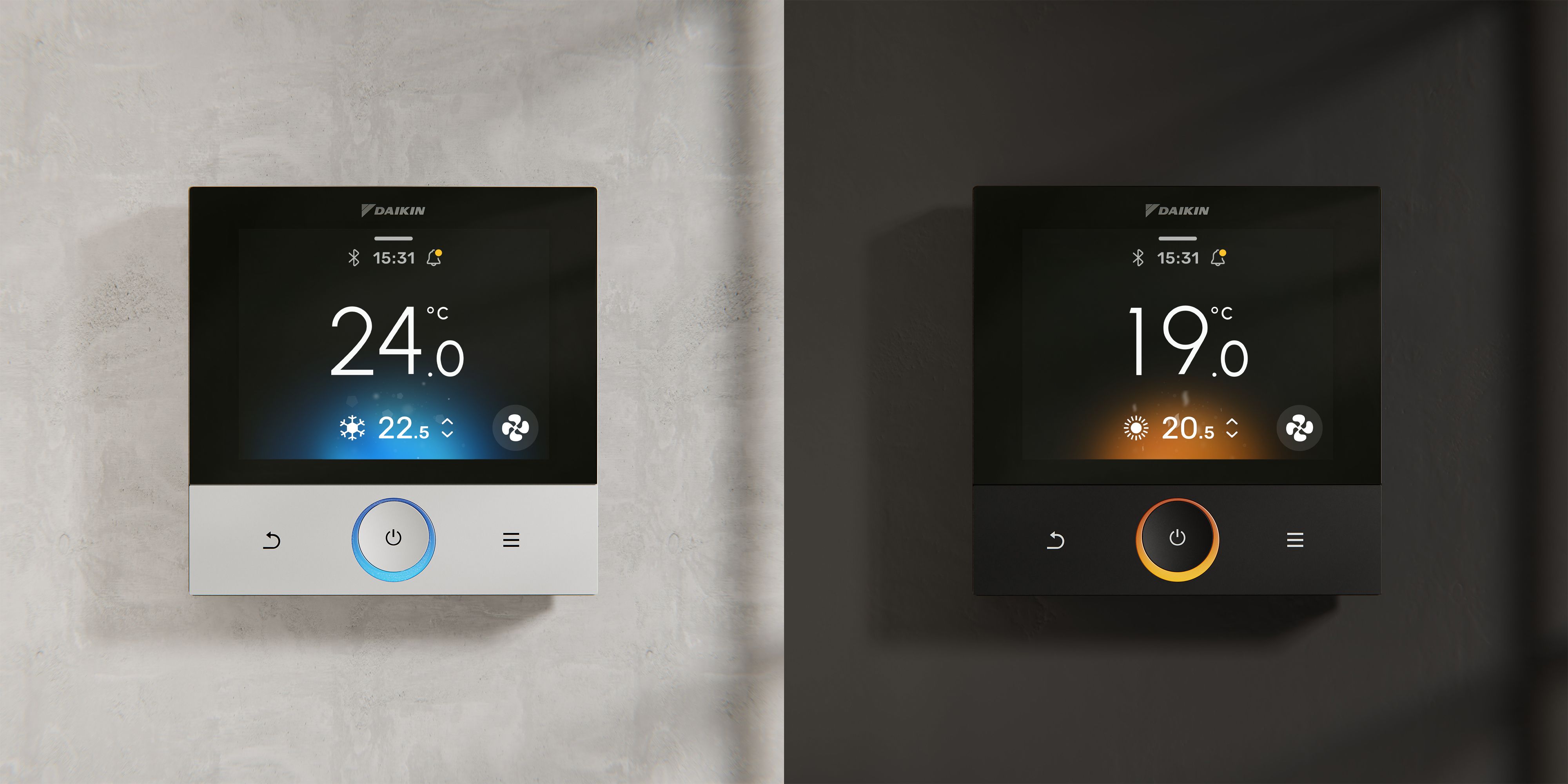 言語や文化が違うどんな人でも簡単に操作できる業務用エアコンのリモコンです。全面をタッチパネルとせず、本体下部に物理ボタンを設けることで、初めてこのリモコンを利用する人でも、操作の手順が理解しやすい工夫を施しています。また、設定温度や風量を調整するインターフェースには、言語ではなく制御を連想させるアイコンを表示し、直感的に操作できます。また、リモコンの液晶画面が消灯するスリープ時でも、液晶の色合いにより、運転状況を一目で把握することができます。本体の外観は直線を基調としたデザインで、黒と白の2色のラインアップを展開しており、ホテルやオフィスなどのさまざまな建築空間と調和するデザインを採用しています。本製品は2026年に発売する予定です。