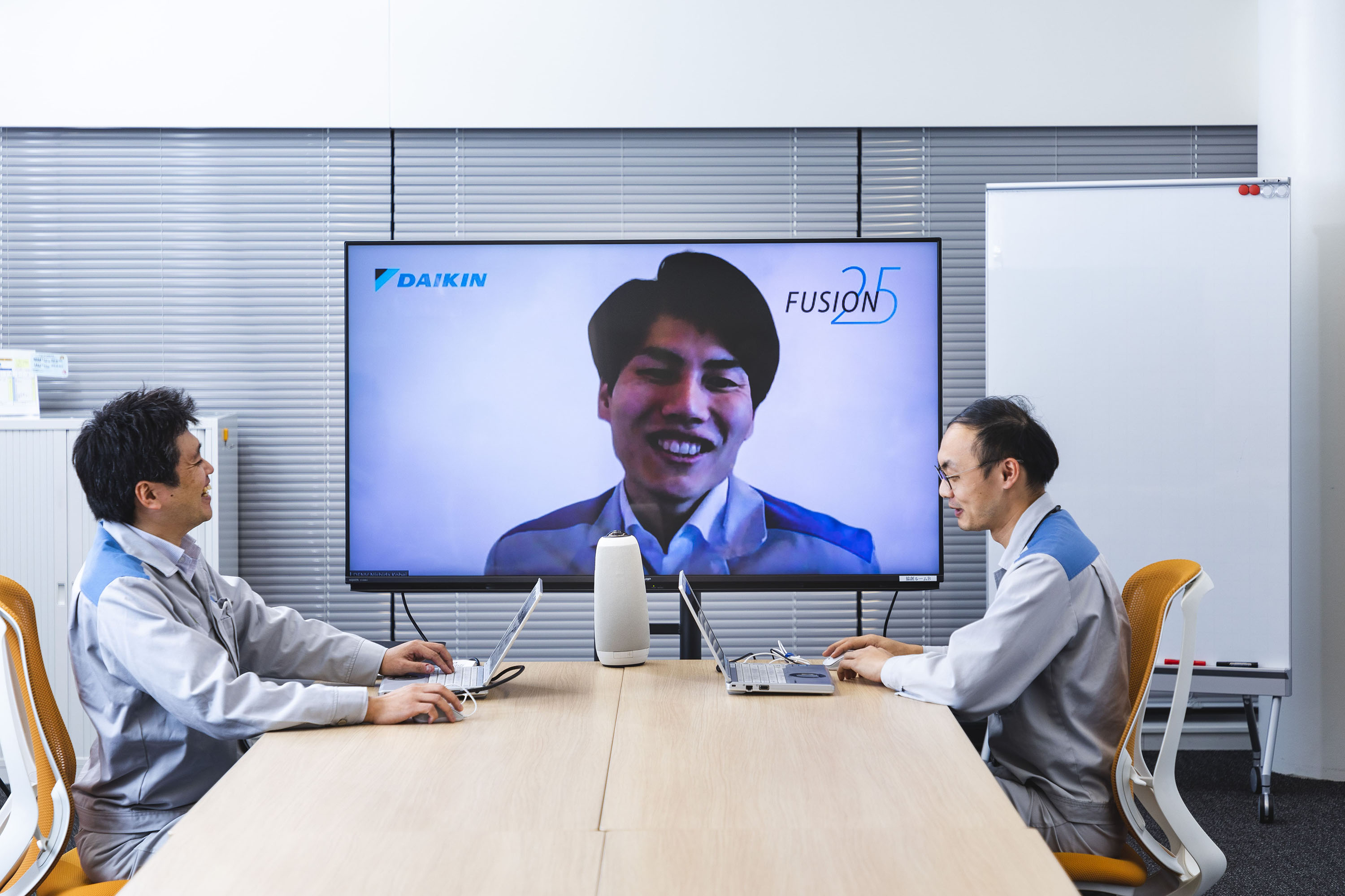 - 私はベルギーにあるダイキンヨーロッパ社に出向しているのですが、日常的なやり取りについては、日本とオンラインで繋いでミーティングをすることも多いです。商品を実際に見てもらう時にはお互いに行き来することもあり、効率と効果のバランスを見ながら、オンラインとオフラインをうまく組み合わせるような働き方を取り入れています。今までは、日本のテクノロジー・イノベーションセンター(TIC)と海外メンバーのやりとりを私のような日本人出向者が仲介する場面が多かったですが、TICと海外メンバーを直接繋ぎ、さらにスムーズな連携を可能とする取り組みも進めています。