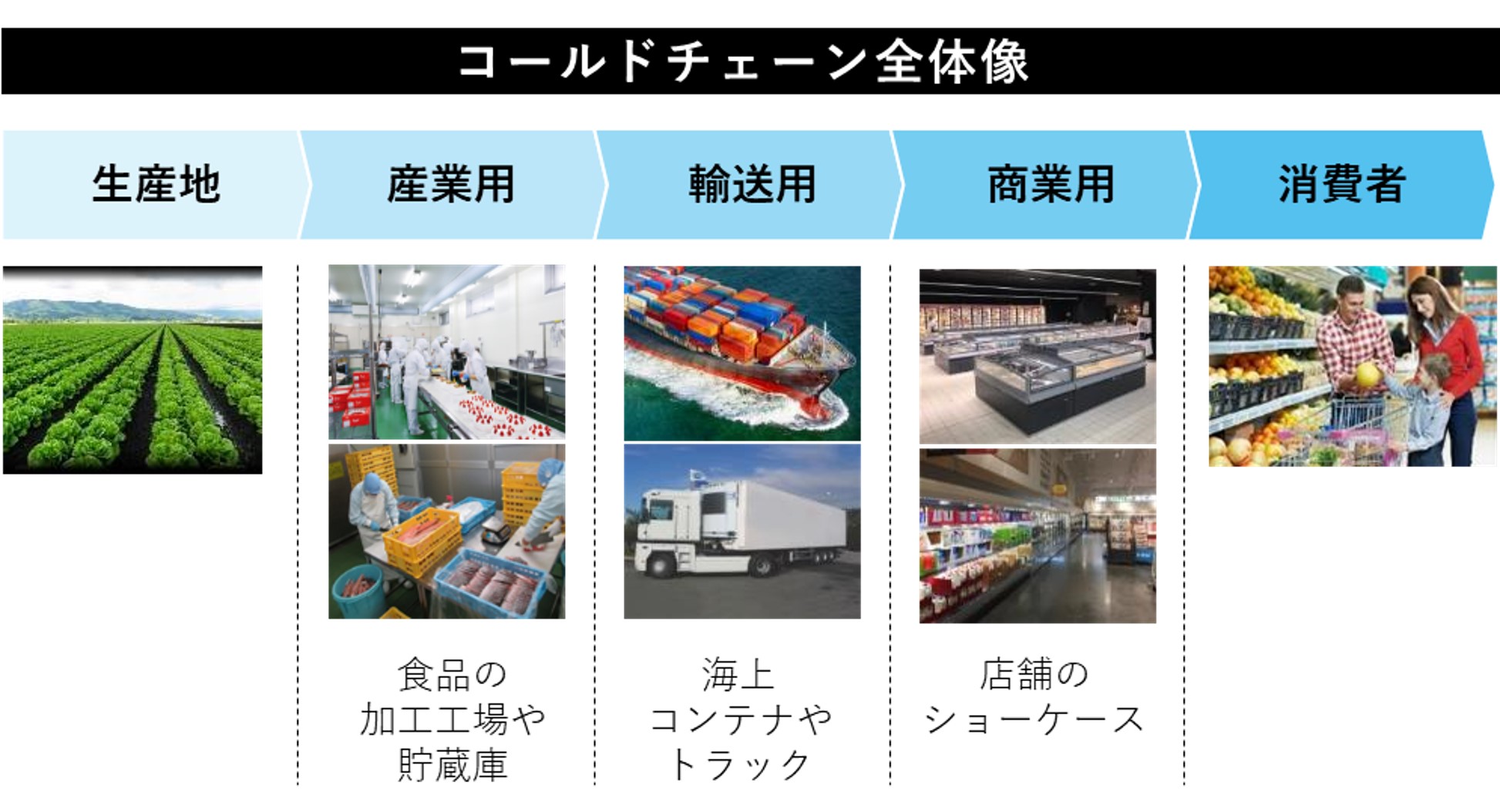食品ロスの問題を解決するために必要となるのが、生産地から消費者までを冷凍・冷蔵のサプライチェーンでつないで流通させる「コールドチェーン」です。ダイキンは「コールドチェーン」で使用される全ての冷凍・冷蔵機器について豊富なラインナップを揃え、食品ロスの削減に貢献しています。