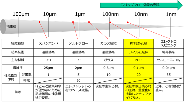 清谷:ダイキンは1995年にPTFEのHEPAフィルタを発売しました。それまでのHEPAフィルタは粒子の捕集にガラス繊維を使っていましたが、これを世界で初めてPTFEに置き換えました。フィルタ素材を速く延伸してエアフィルタに適した微細なPTFE繊維による多孔膜になることを我々が発見したのです。そこでナノファイバーレベルのエアフィルタとして商用化しました。ダイキンの強みとしては、以前から化学事業部で樹脂素材を販売していたので、いろいろなアレンジや加工に対応できる点ですね。またグループ企業のAAF社や日本無機社との協力関係により、最終製品のフィルタユニットまで一貫体制で生産できる点もアドバンテージと言えます。