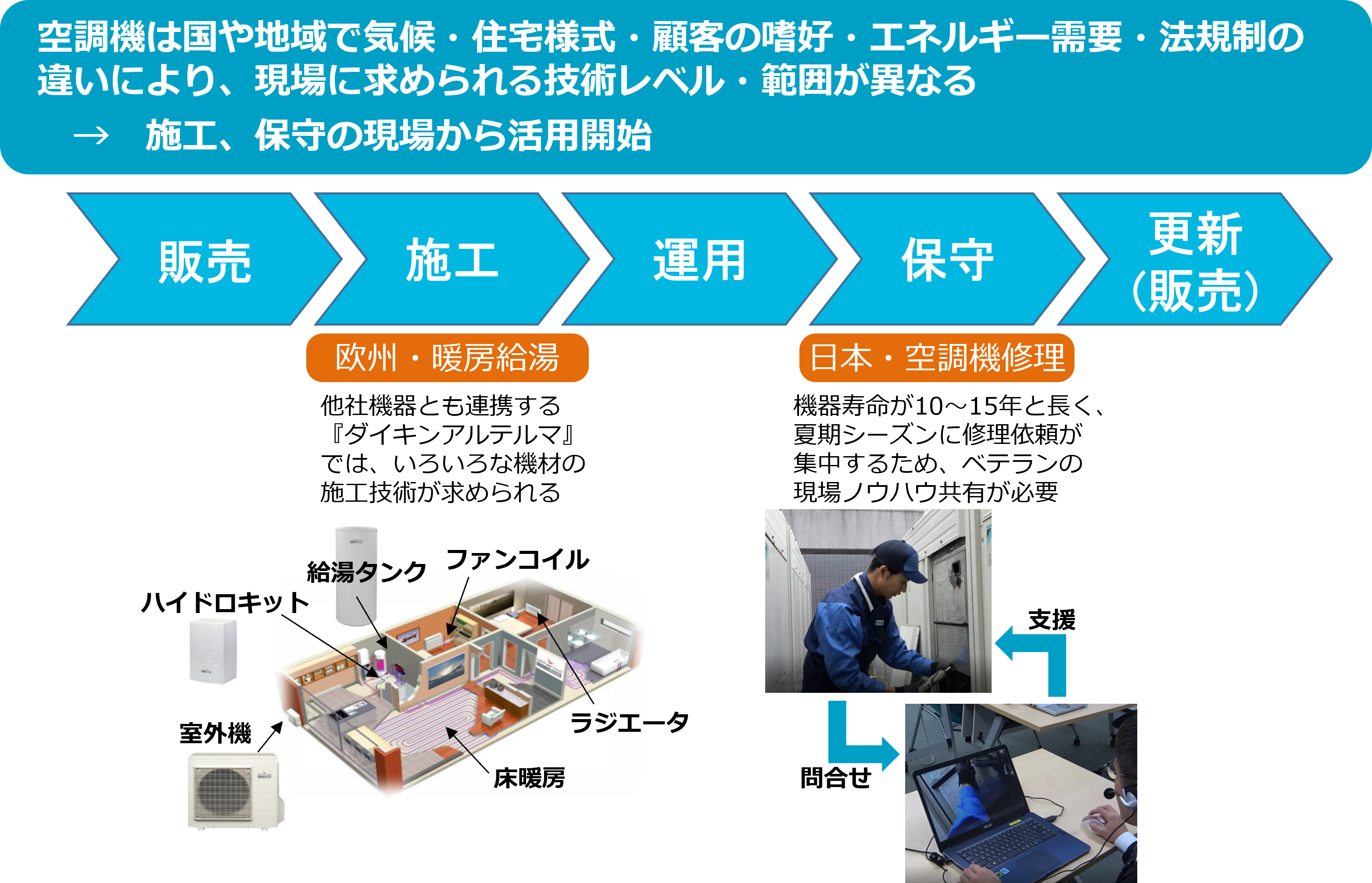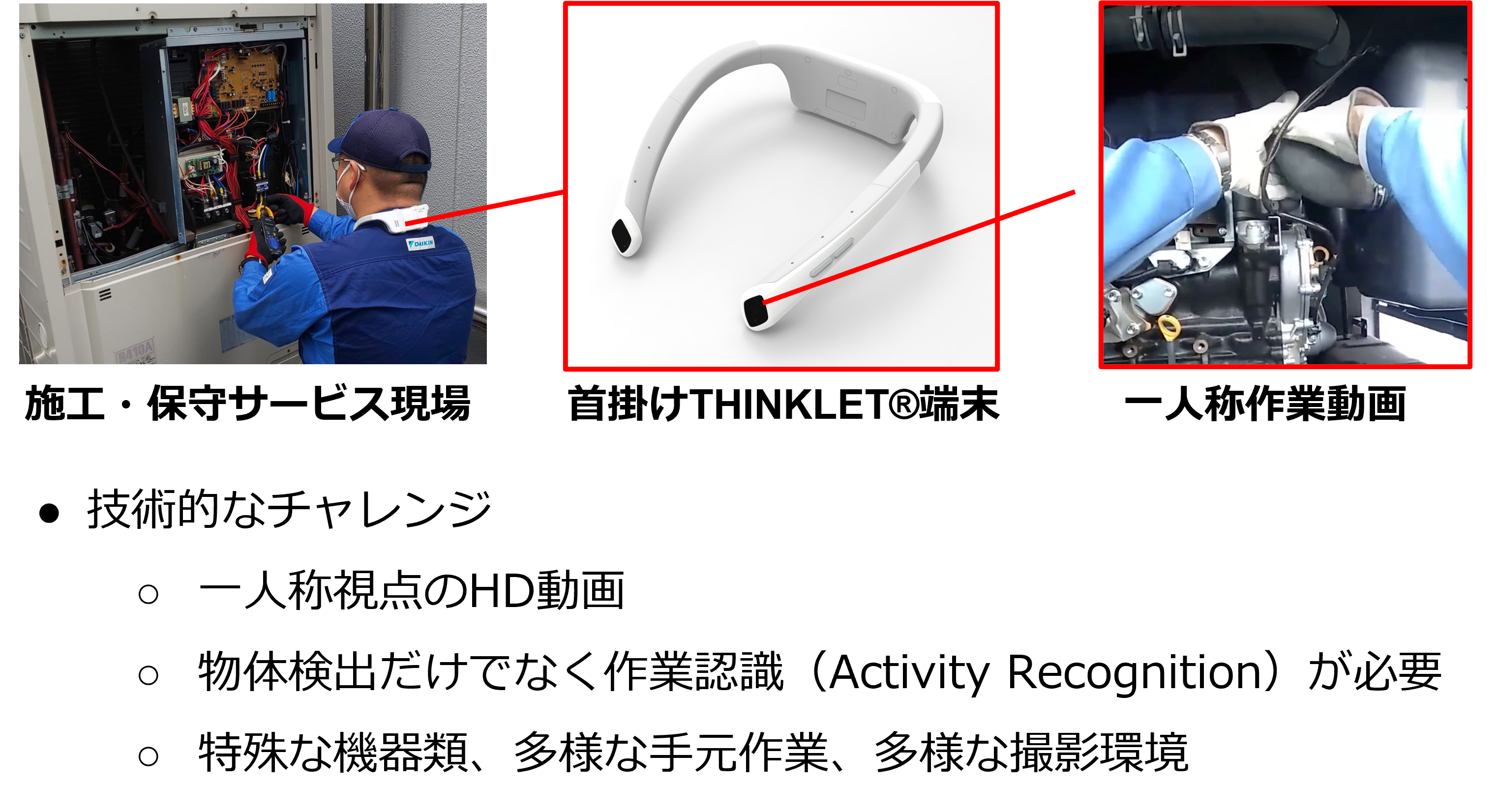 空調機は国や地域によって、気候・住宅様式・顧客の嗜好・エネルギー需要・法規制の違いなどから、現場に求められる技術レベルやカバリングが異なる。そこでダイキンでは、THINKLET®で集めた動画解析の応用を施工・保守の現場からスタートする計画だ。