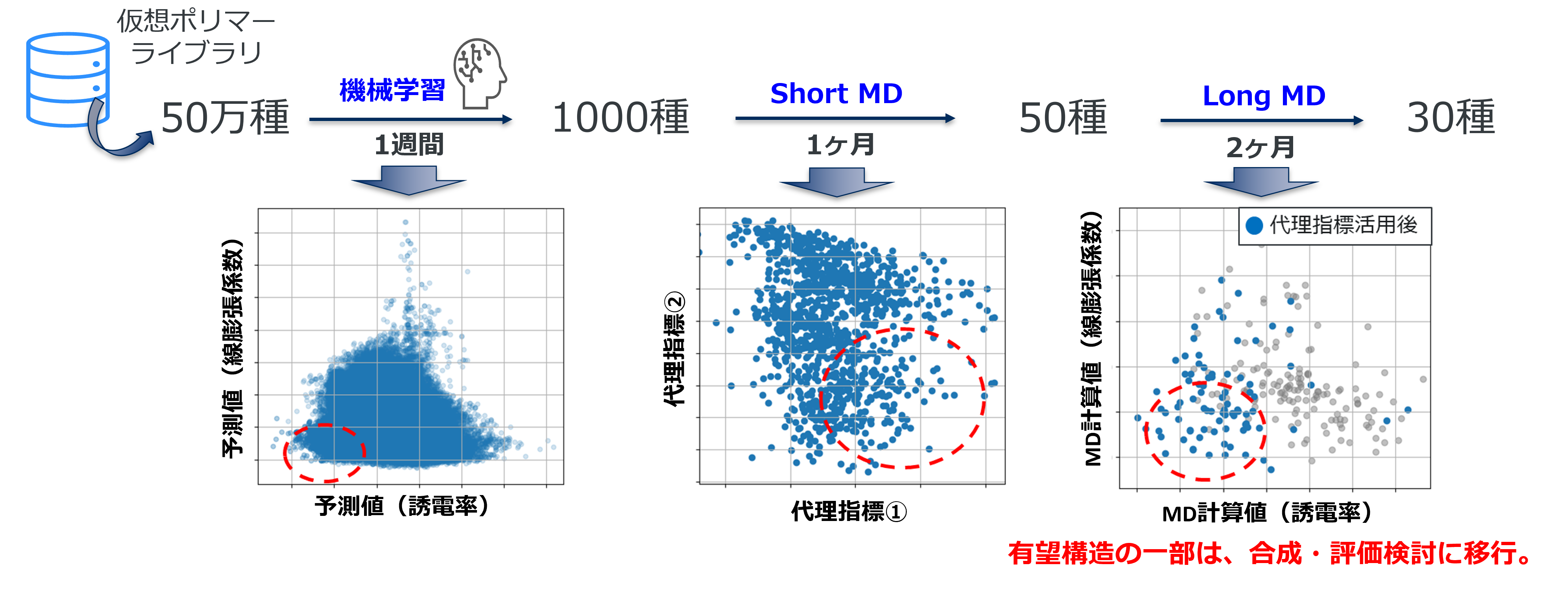 具体的には50万種ものポリマー構造に対し、機械学習で1000種まで絞り込み、さらに代理指標の活用によって多段階スクリーニングを実施することで、最終的に30種類の候補となる分子構造を発見しました。従来の方法でシミュレーションを行って選定しようとすると、とんでもない時間を要しますが、このアプローチの場合は3カ月ほどで効率的に絞り込めるようになりました。