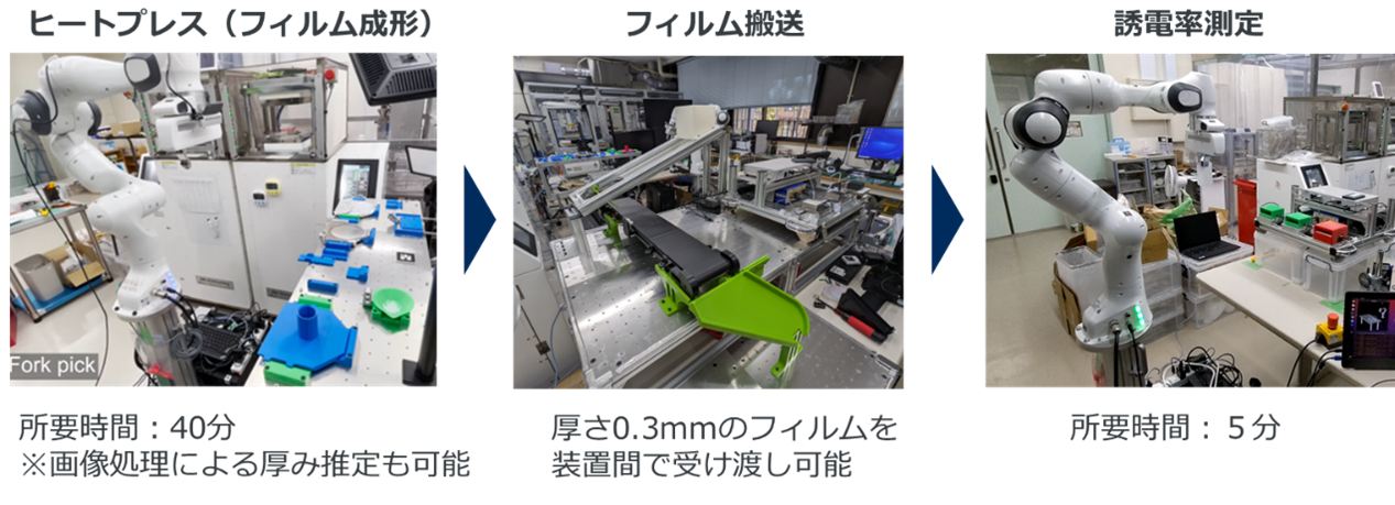 また、ロボットを駆使した自動実験のプロトタイプも東大の研究室と構築しました。これは、人間が手作業に頼っていたサンプル加工から物性測定(誘電率)に至る一連の工程を自動化したシステムです。サンプル移動用のベルトコンベアを採用し、ロボットアームと各種装置を連携させて、人と同等の精度で物性値を再現性高く測定でき、併せて該当の実験データも蓄積可能です。