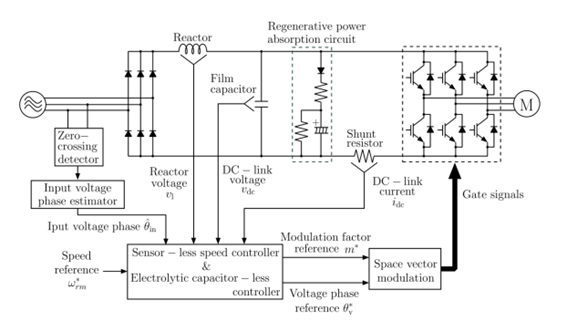 家庭用エアコンに使われている単相電解コンデンサレスインバータの回路構成。今回は業務用エアコンなので、電源は三相となる。