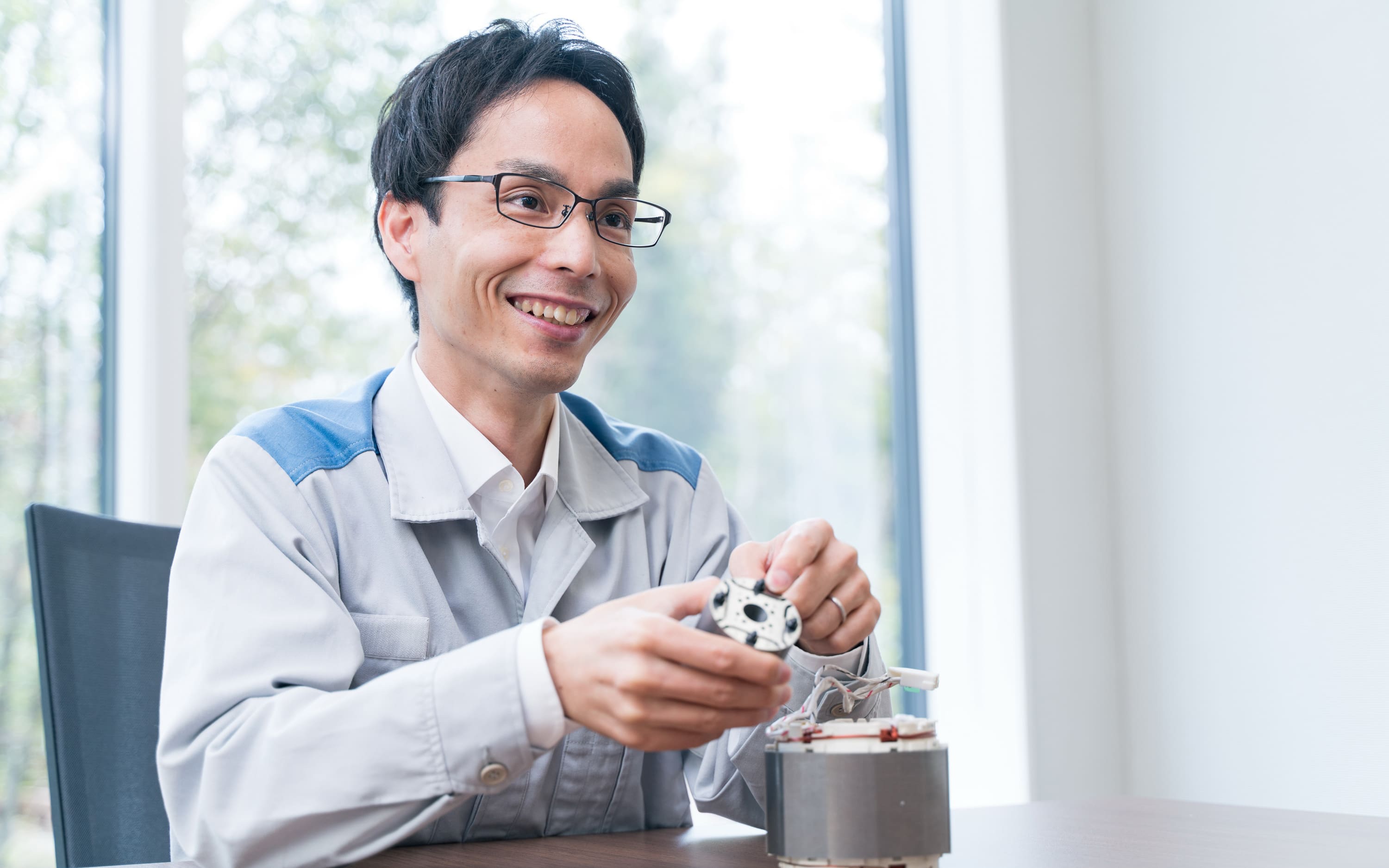 2011年の入社後は、滋賀製作所の環境技術研究所に配属され、希望どおりモータの研究に取り組むことになった。入社当初は大型モータを担当、大型空調機向けのモータのコストダウン開発に4年間取り組んだ後、5年目になるときにルームエアコン用のモータに関わるようになった。