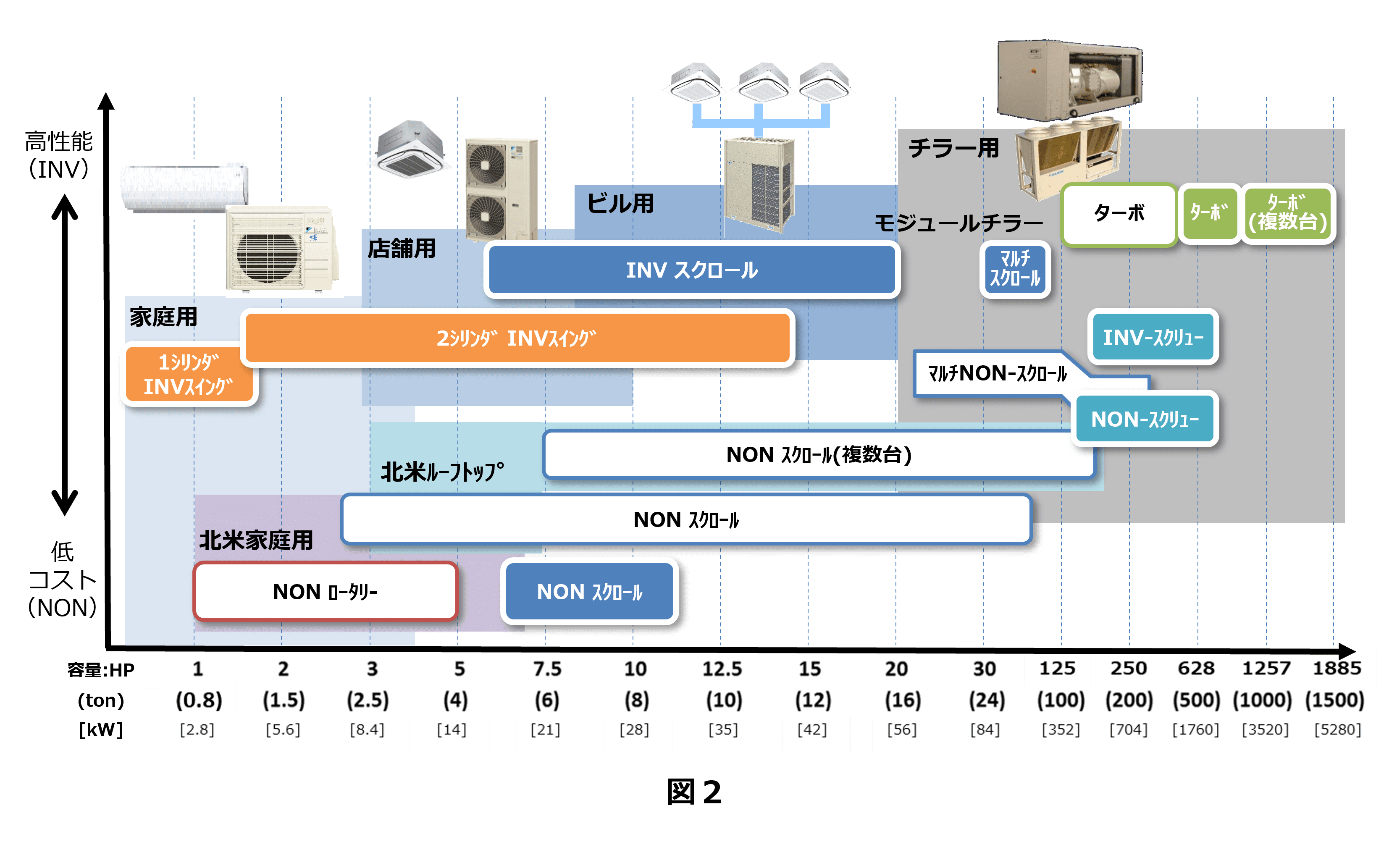 4種類の構造の異なる圧縮機は、用途と容量によって使い分けられています。スイング、スクロール、スクリュー、ターボの順に対応する出力は大きくなっており、低速回転での作動が多い家庭用、店舗用にはスイング、続いてビル用、チラー用のスクロール、チラー用のスクリューとターボというように使い分けられているのです。(図2)
