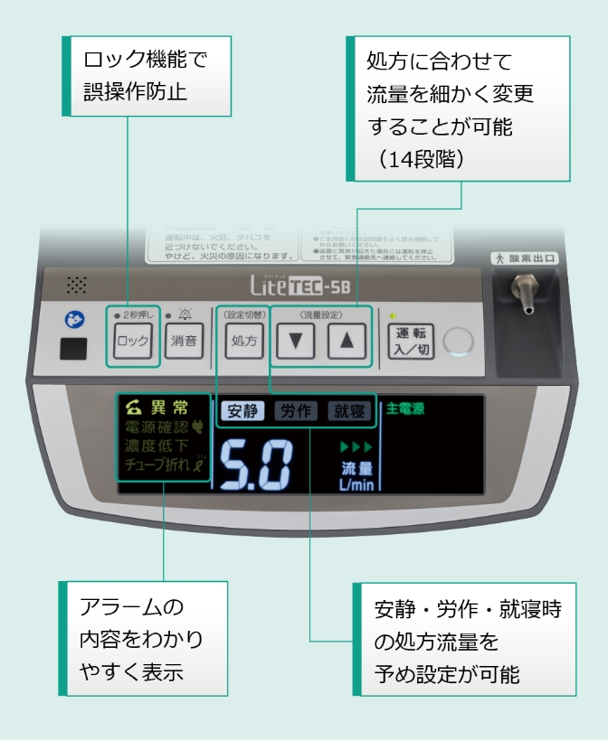 安静時、労作時、就寝時の処方流量をあらかじめ設定することが可能です。